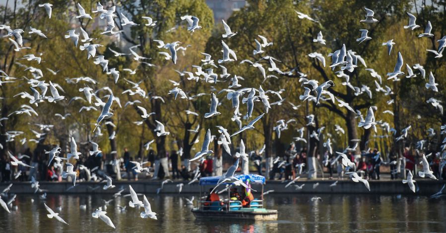 Gulls fly over a park in Kunming, southwest China's Yunnan Province, Dec. 19, 2019. Lots of gulls have migrated to Kunming for the warm winter. (Xinhua/Lin Yiguang)■