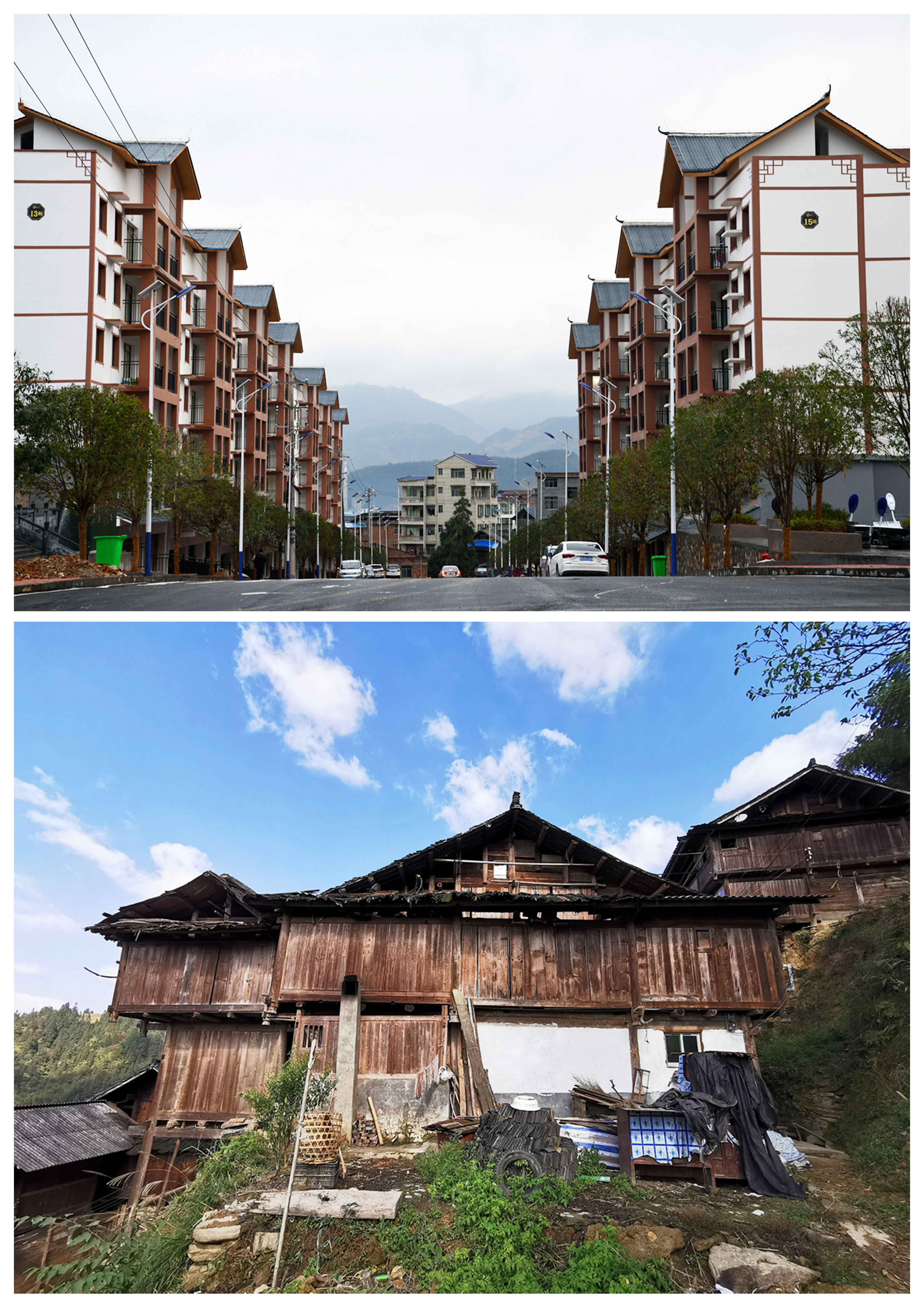 Combo photo taken on Dec. 21, 2019 by Yang Wenbin shows the new residential buildings at a relocation area (up) and photo taken on Dec. 2, 2019 by Wu Dejun shows the former houses of relocated people (down) in Congjiang County, southwest China's Guizhou Province. (Xinhua)
