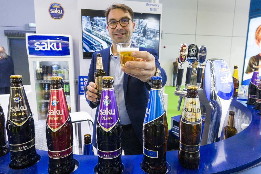 A staff member shows a cup of beer from Estonia at Food and Agricultural Products exhibition area during the second China International Import Expo (CIIE) in Shanghai, east China, Nov. 7, 2019. (Xinhua/Cai Yang)