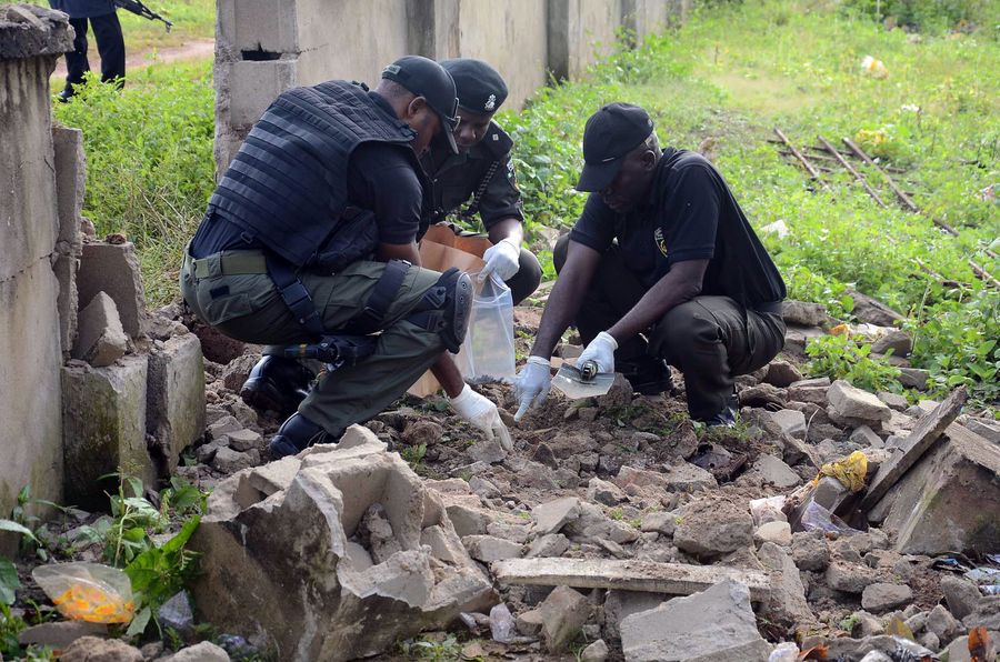 File photo shows Nigeria's security officers were inspecting the scene of a suicide bomb attack in Maiduguri city, northeastern Nigeria, Oct. 2, 2015. (Xinhua/Olatunji Obasa)