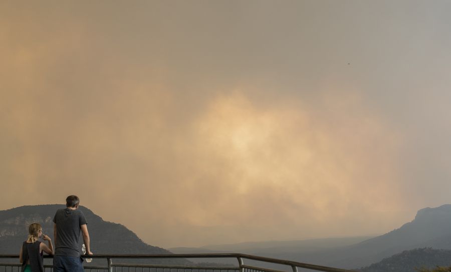 Citizens observe the condition of the bushfire in the smoke-shrouded Blue Mountain area, New South Wales, Australia, Dec. 21, 2019. (Xinhua/Bai Xuefei)