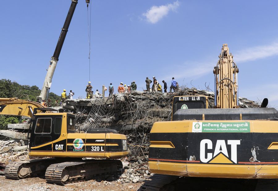 Rescuers work at the site of a collapsed building in Kep city, Kep Province, Cambodia, on Jan. 4, 2020. Seven people died and 18 others were injured after an under-construction building collapsed on Friday. (Xinhua/Mao Pengfei)