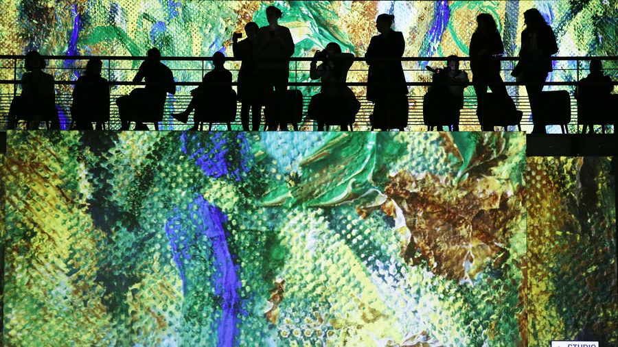 People visit the digital exhibition titled "Monet, Renoir...Chagall: Journeys around the Mediterranean" during a press preview in Paris, France, Feb. 27, 2020. (Xinhua/Gao Jing)