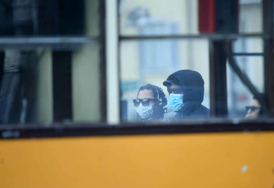 People wear face masks in Milan, Italy, Feb. 26, 2020. A total of 400 people have tested positive for the novel coronavirus in Italy till Wednesday evening. The government has placed 11 towns, 10 in Lombardy and one in Veneto, under lockdown in an effort to contain the epidemic. (Photo by Daniele Mascolo/Xinhua)