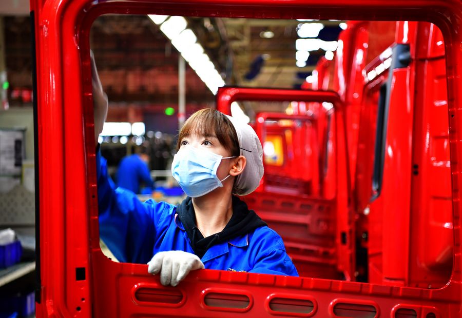 A staff member works in a factory of an automobile company in Xi'an, northwest China's Shaanxi Province, Feb. 27, 2020. (Xinhua/Shao Rui)