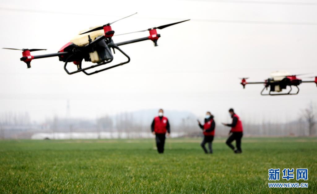 在山東省棗莊市市中區稅郭鎮野崗埠村,工作人員使用植保無人機在麥田里噴灑除草劑(2021年2月27日攝)。