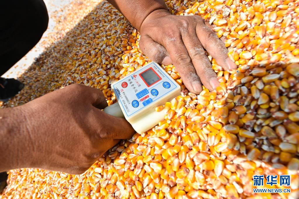 在山西省運城市萬榮縣南張鄉太趙村,種糧戶李挺用儀器測量玉米的含水量(2020年9月20日攝)。據李挺介紹,農機GPS定位、無人機噴灑農藥、機械化收割等已滲透到農業生產的各個環節,臉朝黃土背朝天的農民變成了指揮機器高效種糧的“新農夫”。