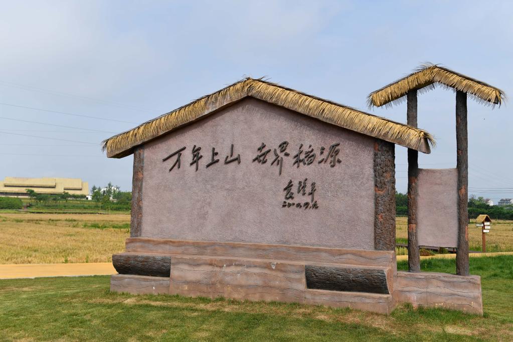 在上山考古遺址公園拍攝的袁隆平院士題詞——“萬(wàn)年上山 世界稻源”(5月12日攝)。新華社記者 黃宗治 攝