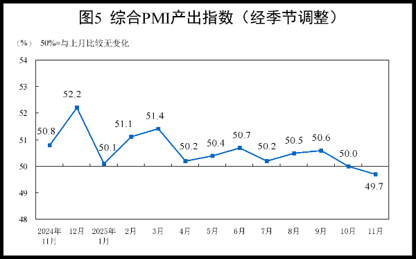 11月份,综合PMI产出指数为49.7%,比上月下降0.3个百分点。