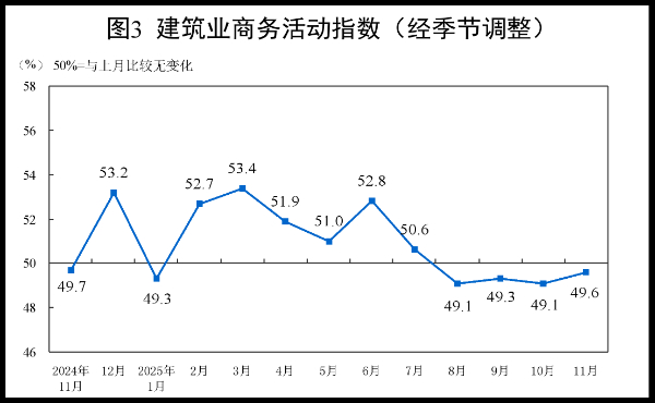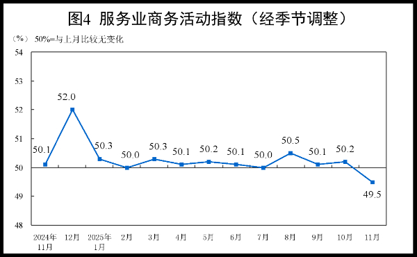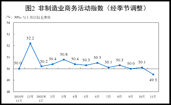 11月份,非制造业商务活动指数为49.5%,比上月下降0.6个百分点。