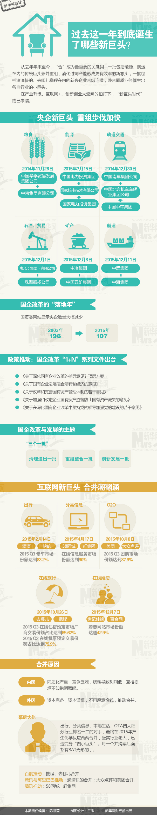 2015年,“央企艦隊(duì)”集結(jié)出發(fā),大重組、大整合時代開啟。年初,中國南車、中國北車——中國最大的兩家軌道交通裝備制造商在分開15年后再度合并。5月,國家核電和中國電力投資集團(tuán)宣布正式合并,新公司資產(chǎn)規(guī)模超過7000億元。