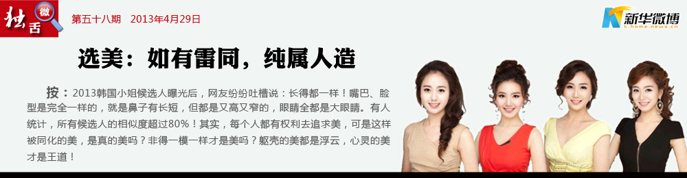 【選美?公然作弊?】 整容技術(shù)越來(lái)越先進(jìn),偽造美麗卻到了該反思的地步。韓國(guó)小姐的比賽分為真、善、美三個(gè)競(jìng)賽部分。現(xiàn)在看來(lái),比賽已經(jīng)無(wú)法體現(xiàn)“真”這個(gè)部分了。
