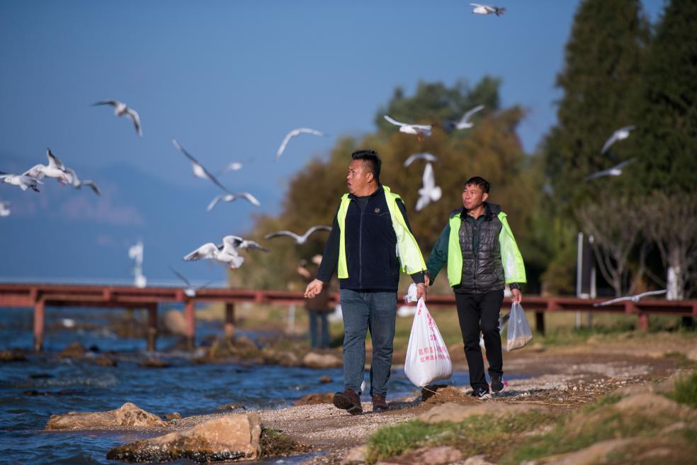 入冬以来,数万只红嘴鸥如期飞抵昆明越冬。志愿者张利云在滇池畔像往年一样投喂红嘴鸥。“四十年的相伴,这些小家伙早已成为我们的家人。”他说。