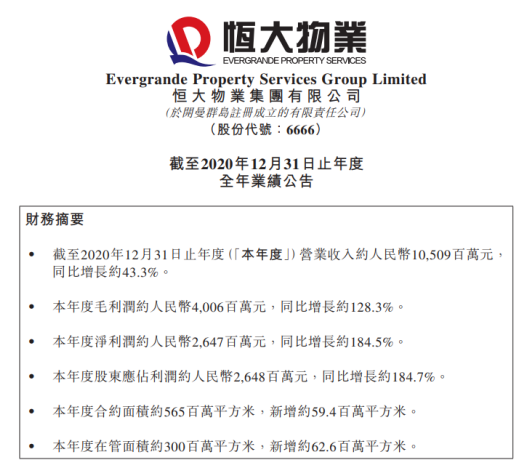 數據顯示,2020年恒大物業實現營業收入105.09億元,同比增43.31%;毛利潤40.06億元,同比增128.26%;凈利潤26.47億元,同比增184.32%;現金余額126.04億元,同比增1742.69%;合約面積達5.65億平方米,同比增長11.88%;在管面積達3億平方米,同比增長26.05%。