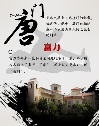 富力 唐門 唐門用毒之名,天下皆知。 富力擁有一級開發資質,卻總是遭業主維權。因壓縮成本、過快擴張導致的質量問題一再曝光。讓購房人后悔不迭,因此說富力是房企內的“唐門”。