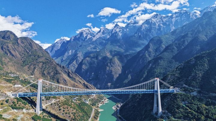 这是全长882.5米的虎跳峡金沙江铁路大桥。大桥起于玉龙雪山隧道出口,止于哈巴雪山隧道进口,是丽香铁路的重点控制性工程(2025年11月21日摄,无人机照片)。新华社发(杨紫轩摄)