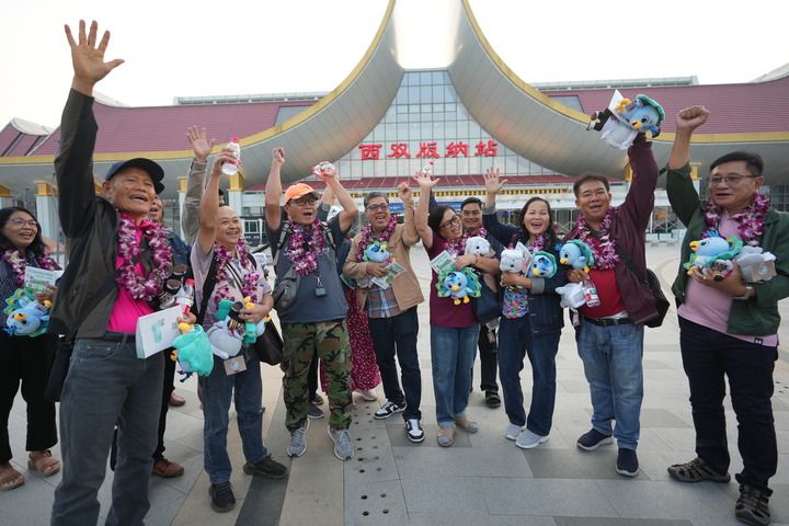 来自泰国和老挝的游客在中老铁路西双版纳站留影(2025年2月18日摄)。新华社记者 陈欣波 摄