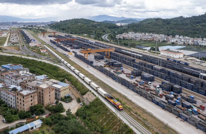 前往老挝万象的国际货物列车驶出中老铁路玉溪研和站(2025年8月23日摄,无人机照片)。新华社记者 陈欣波 摄