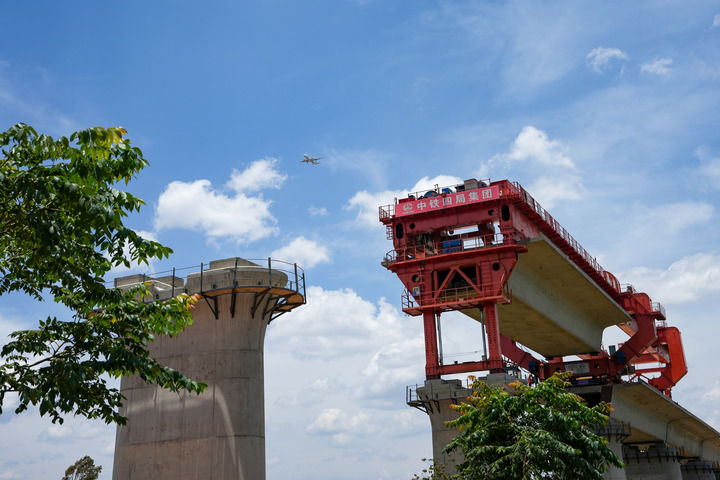 中铁四局渝昆高铁昆明枢纽段八家村跨沪昆铁路特大桥架梁施工现场(2025年5月21日摄)。新华社记者 陈欣波 摄