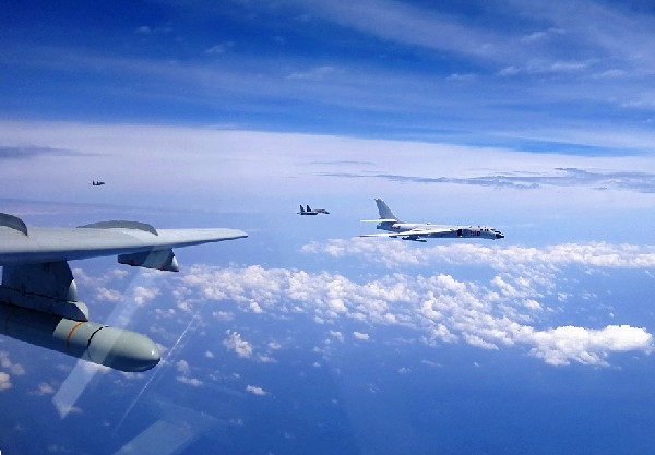 ?。丛拢保溉找詠恚哲姵鰟愚Z-6K、蘇-30、殲-11和偵察機、預警機等多型多架戰機,開展了海上方向實戰化軍事訓練。轟-6K等戰機實施了“繞島巡航”訓練課題,提升了機動能力,檢驗了實戰能力。