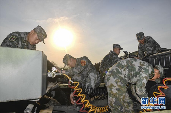 5月9日,沈陽聯勤保障中心某汽車運輸旅一營戰士對車輛進行維修保養。新華社記者 許暢 攝