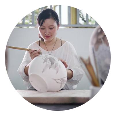 我從小就很喜歡繪畫,大學的時候認識了我的先生,他帶我去了醴陵。當時我看到幾個小女孩拿毛筆在瓶子上細細地勾線,我很喜歡她們這種狀態,想著自己也可以嘗試一下。父親也很鼓勵我,想讓我從事這方面的工作,所以常常帶我去寫生,慢慢地我就愛上了這門技藝。我們醴陵瓷傳統的核心工藝是分水,父親在傳統工藝中總結出“薄施淡染”技法,主要表現對象是花卉,它能使花卉層次更加豐富、水靈通透,體現醴陵瓷清雅淡逸、意態高潔的陶瓷語言,所以我們現在的創作仍然以花卉為主,而這次在清華的學習,讓我拓寬了許多思路,我想在山水和其他物象中嘗試去用我們工藝來表現,希望今后能給觀者帶來一些新的感受。