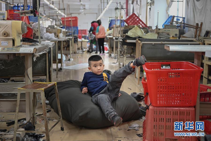 1月26日,在福建省石獅市的金利萊斯服裝廠,聰聰坐在準備寄回老家的禮物布袋上玩耍。
