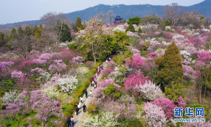 2月14日,游人在南京梅花山賞花(無人機照片)。新華社發(蘇陽 攝)