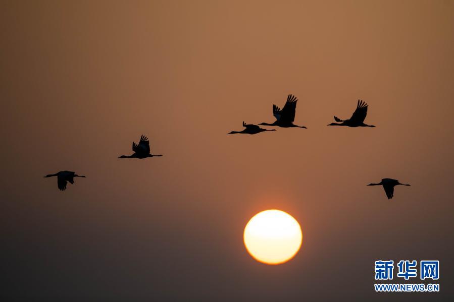 日出時分,黑頸鶴在大山包黑頸鶴國家級自然保護(hù)區(qū)飛翔(2月27日攝)。新華社記者 胡超 攝