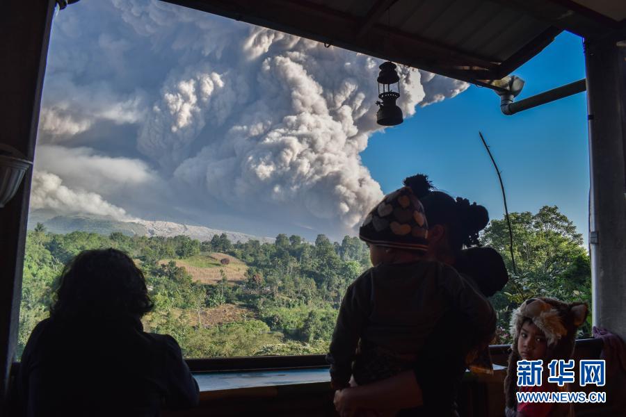 3月2日,人們在印度尼西亞北蘇門答臘省卡羅觀看噴發(fā)的錫納朋火山。新華社發(fā)(森比林攝)
