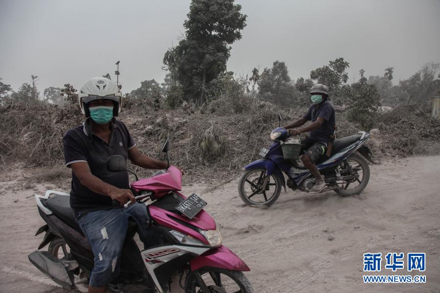 3月2日,印度尼西亞北蘇門答臘省卡羅的居民行駛在火山灰覆蓋的道路上。印度尼西亞國家抗災署2日說,北蘇門答臘省錫納朋火山當天上午劇烈噴發,噴出的火山灰高達5000米。目前尚無人員傷亡和財產損失報告。