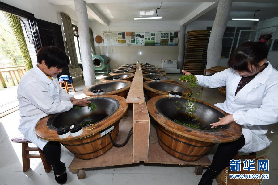 3月12日,在杭州市西湖風景名勝區(qū)滿覺隴村的中國茶葉博物館滿覺隴炒茶中心內,茶農(nóng)在手工炒制西湖龍井茶。