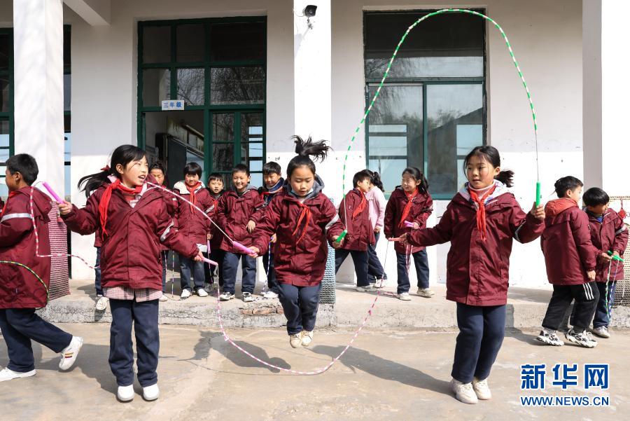 騎路小學三年級學生們在課間練習“三人車輪轉”跳繩(3月10日攝)。新華社記者 楊磊 攝