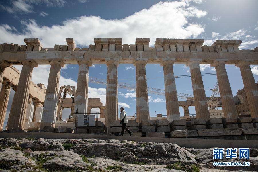 3月22日,一名游客游覽希臘雅典衛城。希臘露天考古遺跡22日起恢復開放。游客需遵守保持社交距離和佩戴口罩等防疫規定。新華社發(萊夫特里斯·帕察里斯攝)