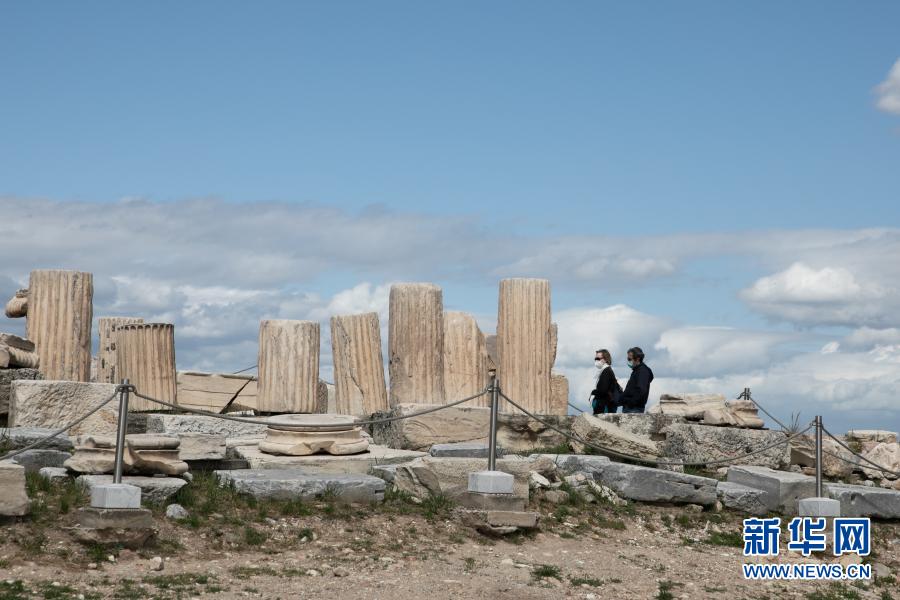 3月22日,游客游覽希臘雅典衛城。希臘露天考古遺跡22日起恢復開放。游客需遵守保持社交距離和佩戴口罩等防疫規定。新華社發(萊夫特里斯·帕察里斯攝)