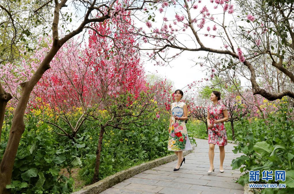 3月26日,“春暖浦東 十里桃花”2021上海桃花節(jié)開幕儀式在浦東南匯惠南鎮(zhèn)桃花村舉行,兩名當(dāng)?shù)仄炫蹍f(xié)會(huì)的姑娘在桃花村賞花。