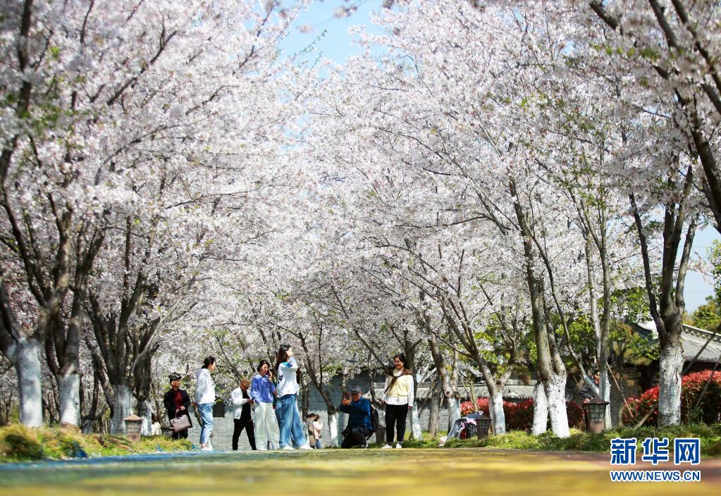 3月26日,游客在江蘇省揚(yáng)州市邗江區(qū)甘泉街道的櫻花園賞花拍照。