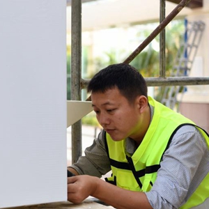 4月10日,工作人員在安裝新聞中心網絡設施。
