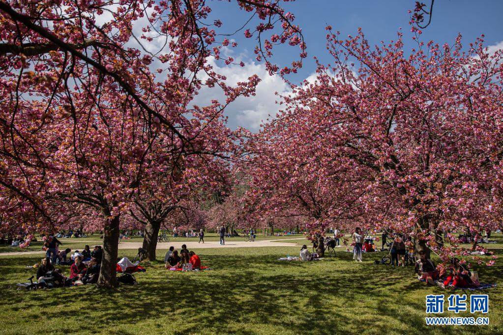 4月20日,人們在法國巴黎近郊的國璽公園欣賞櫻花。