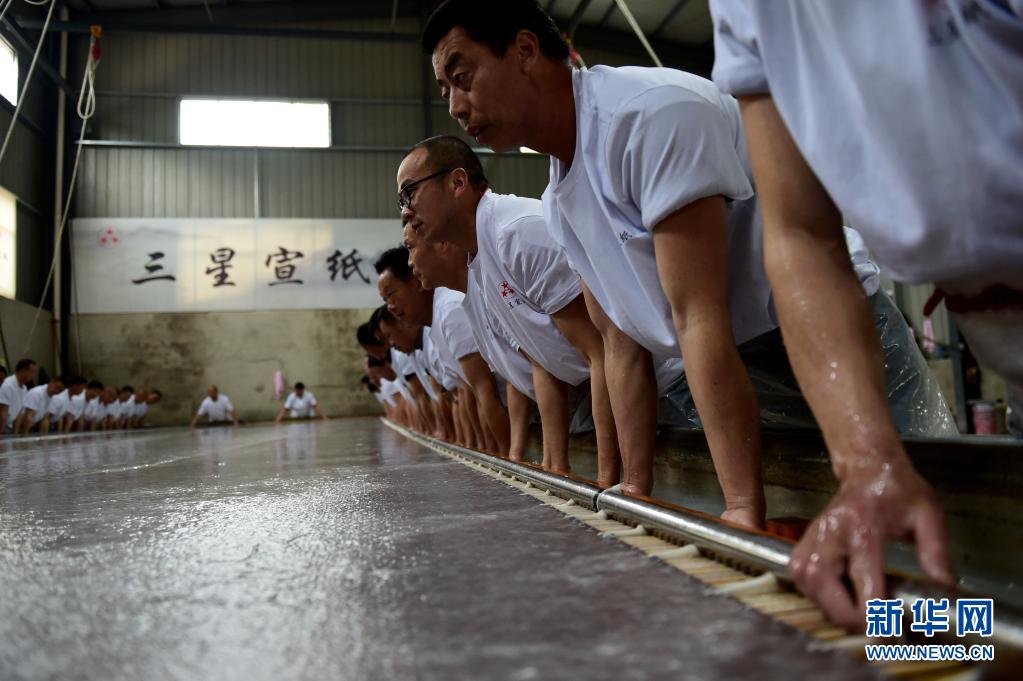 近日,在宣紙產地安徽省宣城市涇縣,“四丈宣紙”的抄制在一家紙業有限公司啟動。50余名撈紙師傅操作巨型紙簾,齊心協力,在紙槽旁進行撈紙作業。來回起落兩次,動作整齊劃一。隨后工人們將紙簾吊起放至一邊揭下,一張巨大的宣紙便撈制成功。經過曬、剪等工序后, 制成長13.2米、寬3.6米的巨型宣紙就是“四丈宣紙”。