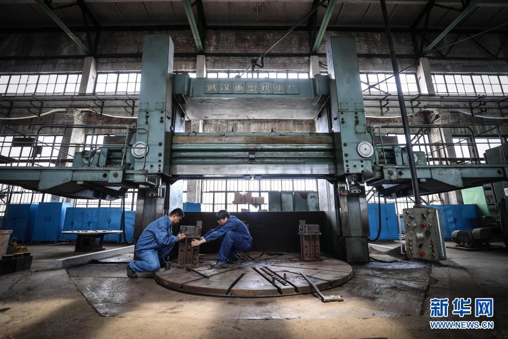 4月30日,王尚典(右)與同事對機床進行調(diào)整準備加工配件。