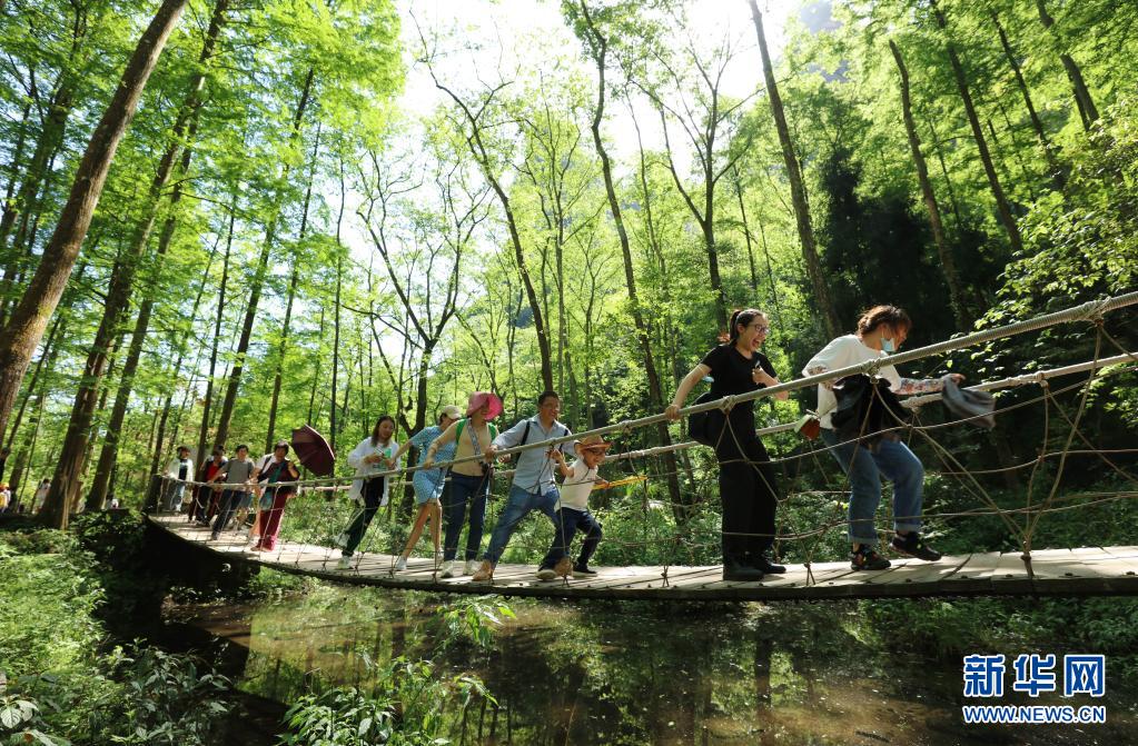 5月1日,游人在湖南省張家界市武陵源區(qū)金鞭溪景區(qū)游玩。