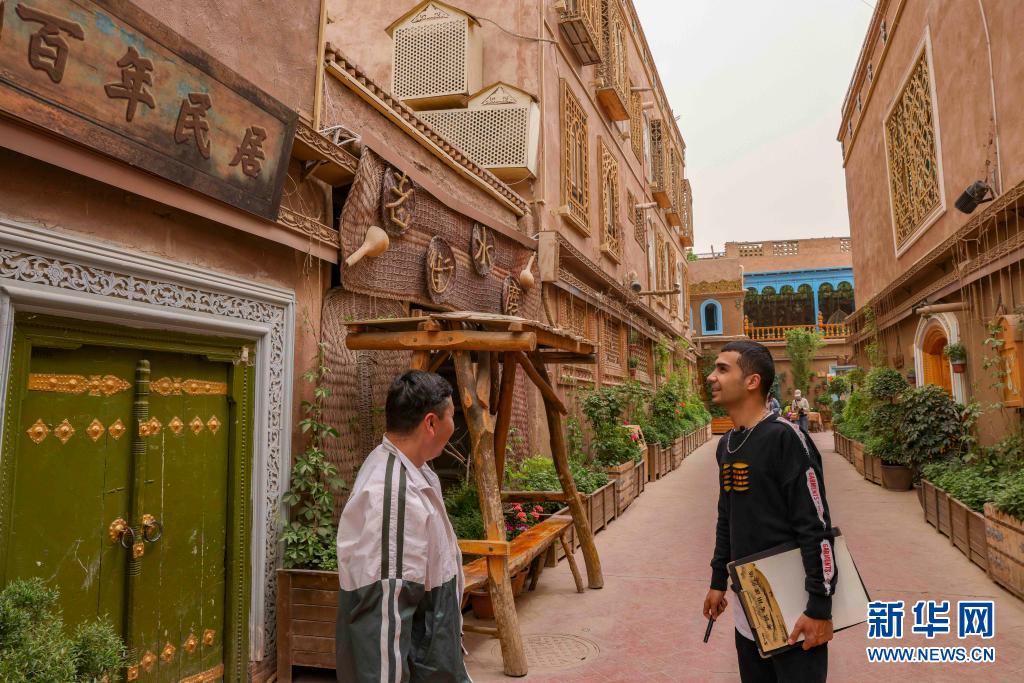 麥麥提吐爾遜江·麥麥提依明(右)和朋友在新疆喀什古城景區尋找創作素材(5月6日攝)。新華社記者 胡虎虎 攝