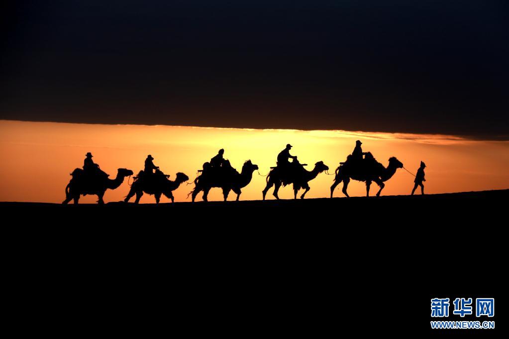 5月15日,游客騎駱駝在甘肅省敦煌市鳴沙山月牙泉景區(qū)游覽。晨光下,云彩、沙山、駝隊構(gòu)成了一幅美麗迷人的畫卷。新華社發(fā)(張曉亮 攝)