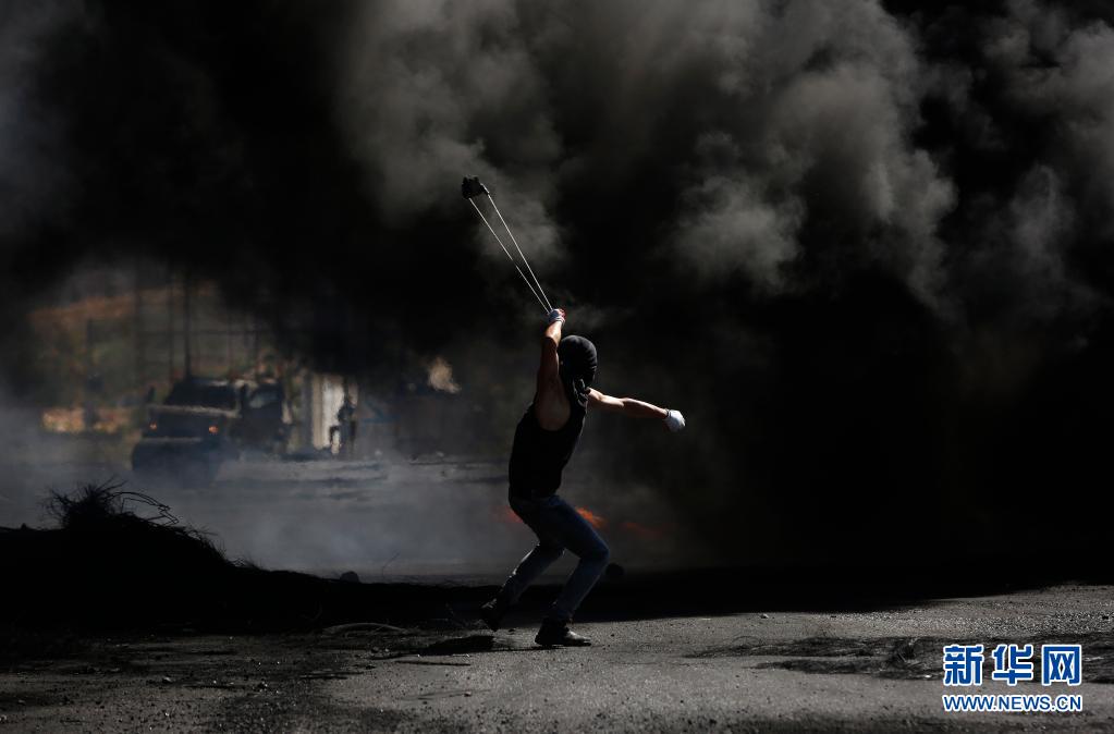 5月18日,一名巴勒斯坦示威者在約旦河西岸城市納布盧斯附近的沖突中向以色列士兵投擲石塊。