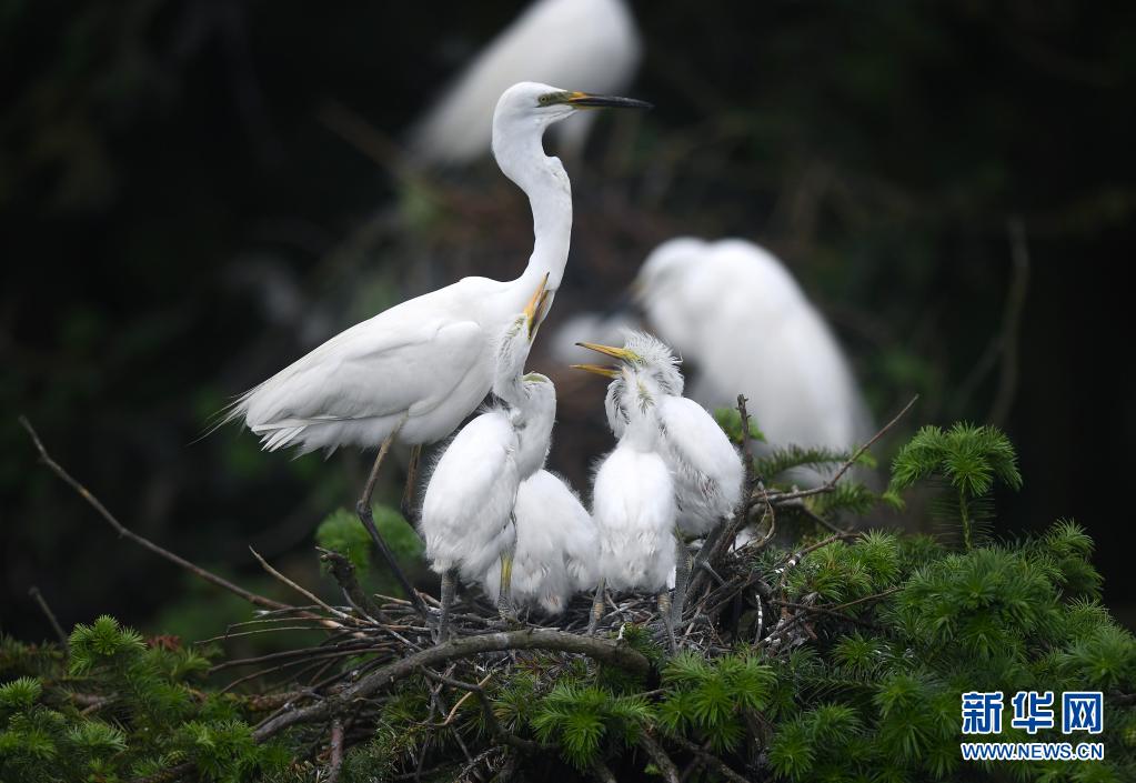 在南昌市新建區(qū)象山森林公園內,白鷺和雛鳥們在一起(5月18日攝)。