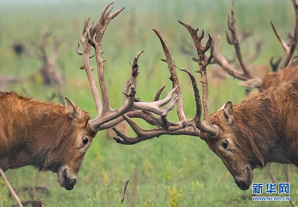 5月17日,麋鹿在石首麋鹿國家級自然保護區內活動。新華社記者 肖藝九 攝