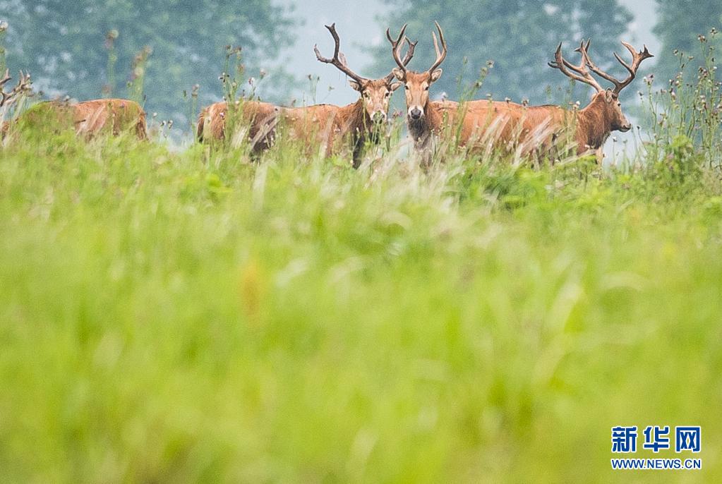 5月17日,一群麋鹿在石首麋鹿國家級自然保護區內活動。新華社記者 肖藝九 攝