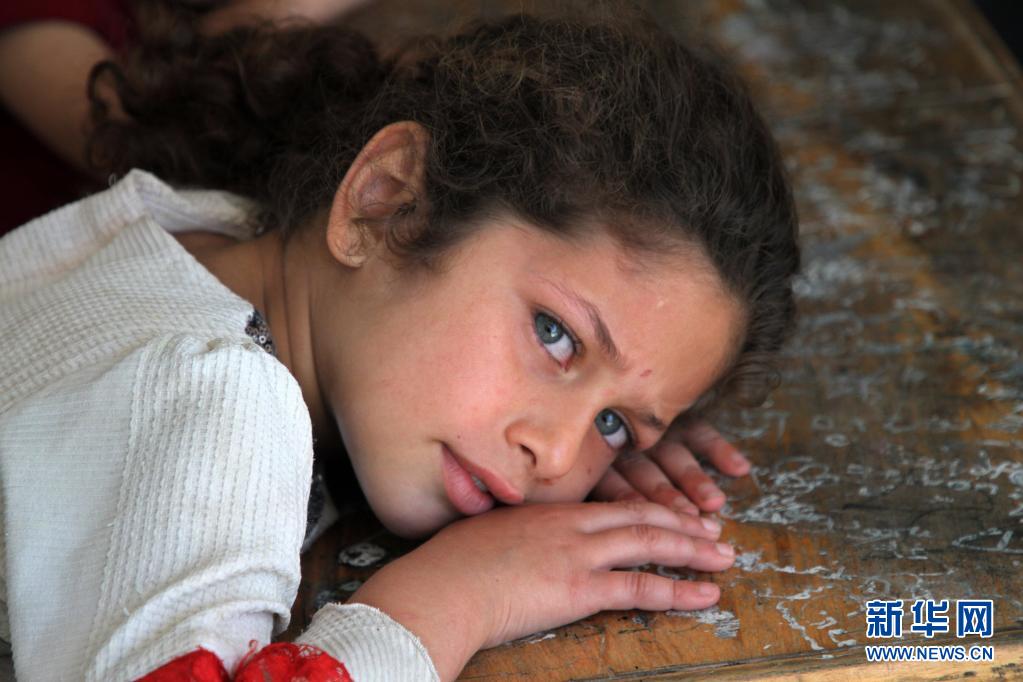 5月19日,受空襲影響而逃離家園的7歲巴勒斯坦兒童巴斯馬·阿布·拉薩斯在加沙城的一所學校臨時棲身。