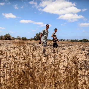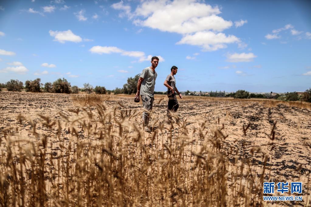 5月22日,在加沙地帶汗尤尼斯,巴勒斯坦農民查看被以色列炮擊燒焦的麥田。新華社發(亞西爾攝)